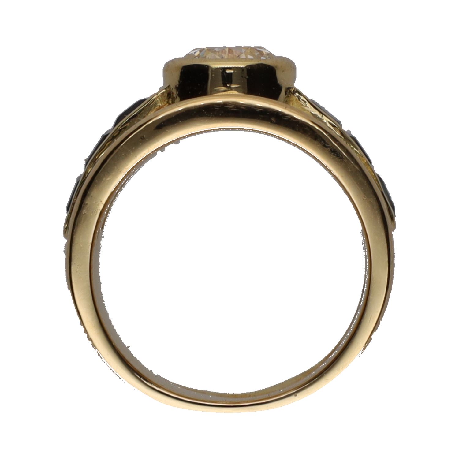 Sortija en oro amarillo con brillante central y detalles con brillantes y zafiros. Talla 12.
