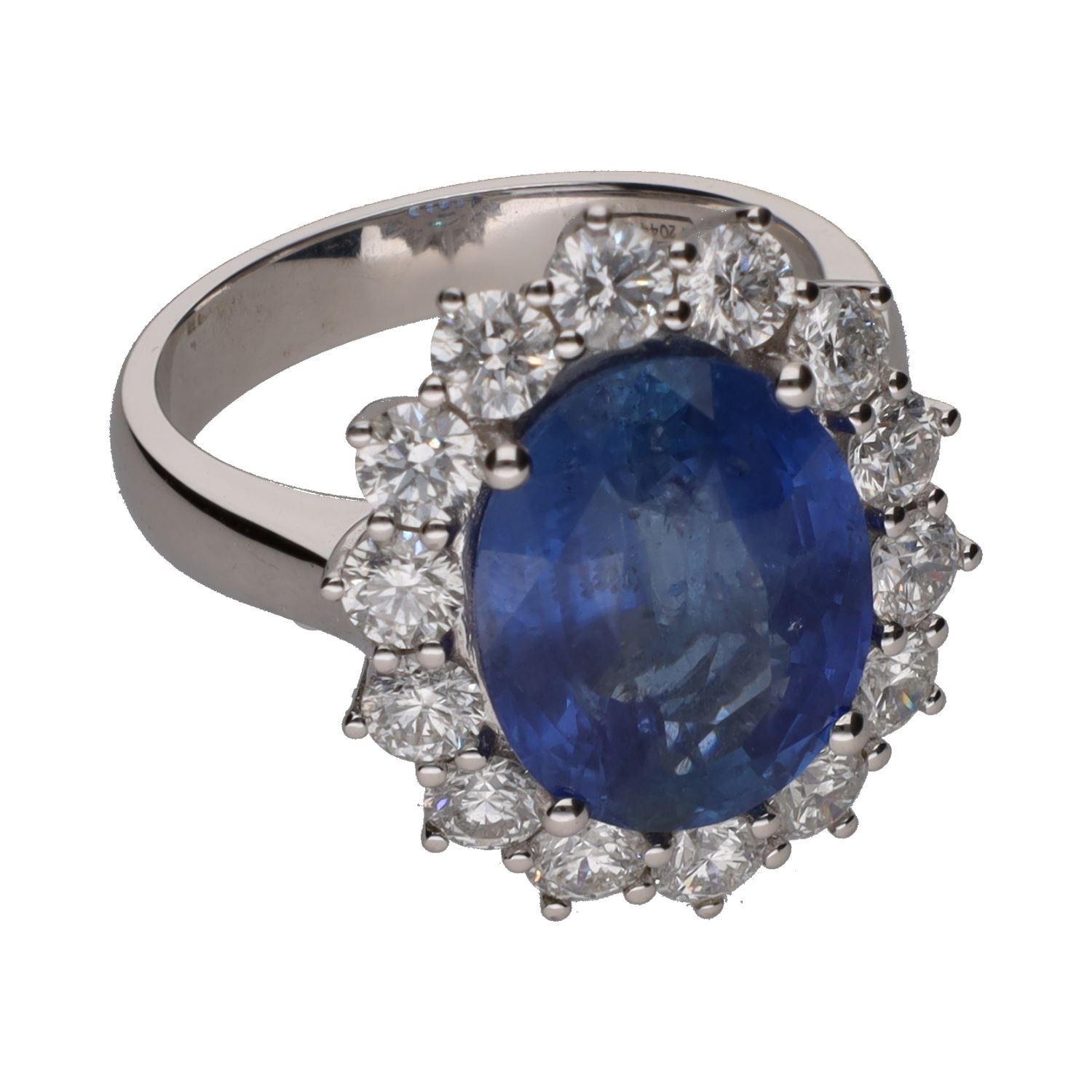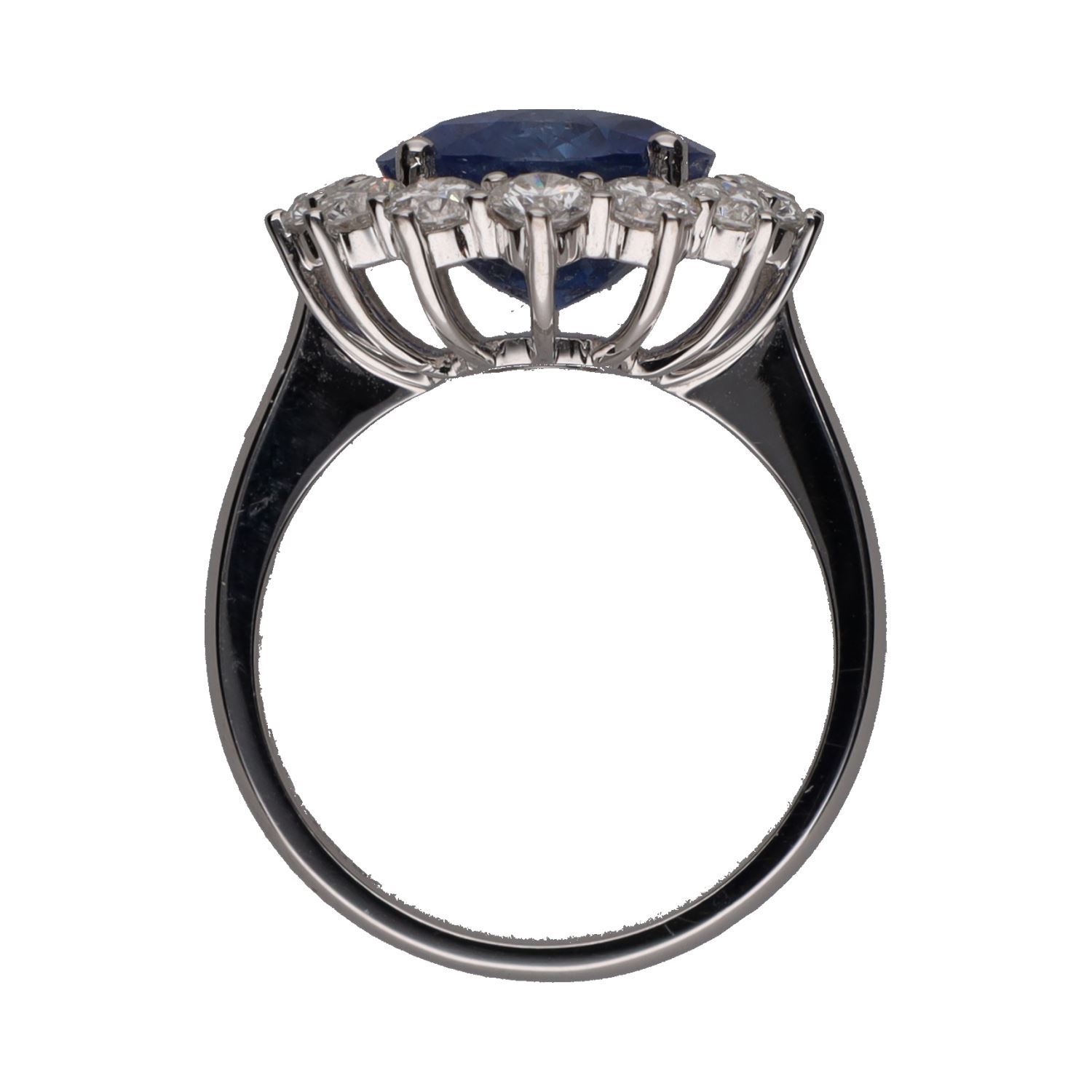 Sortija en oro blanco con zafiro central y orla de brillantes. Talla 14.