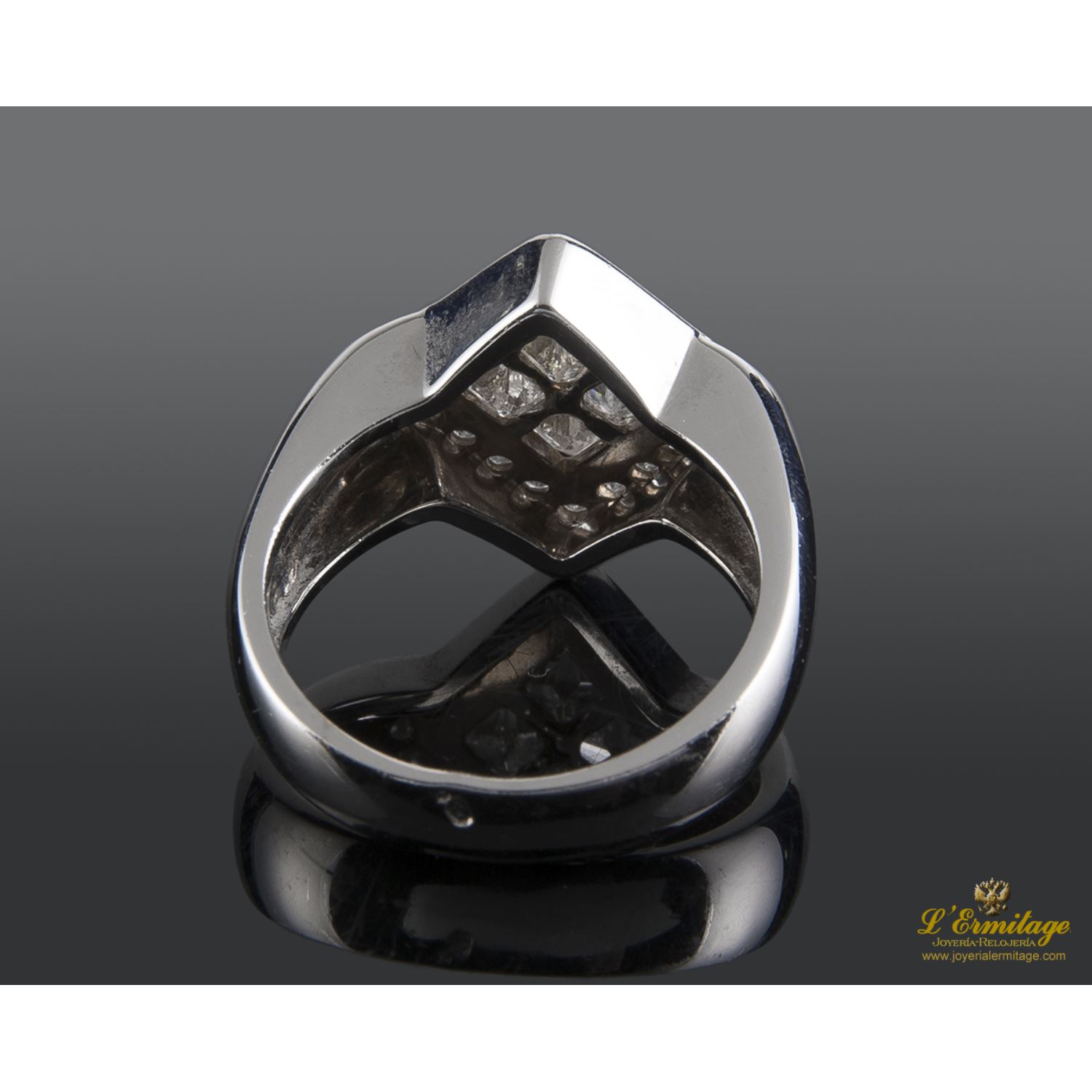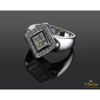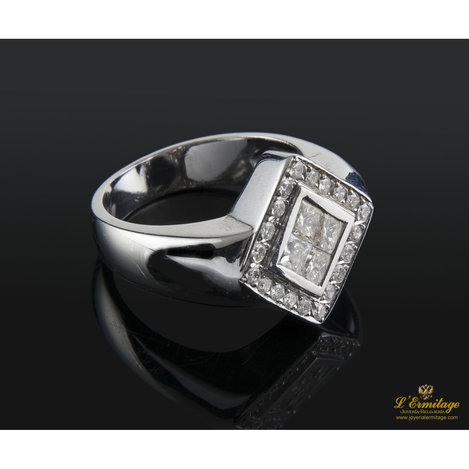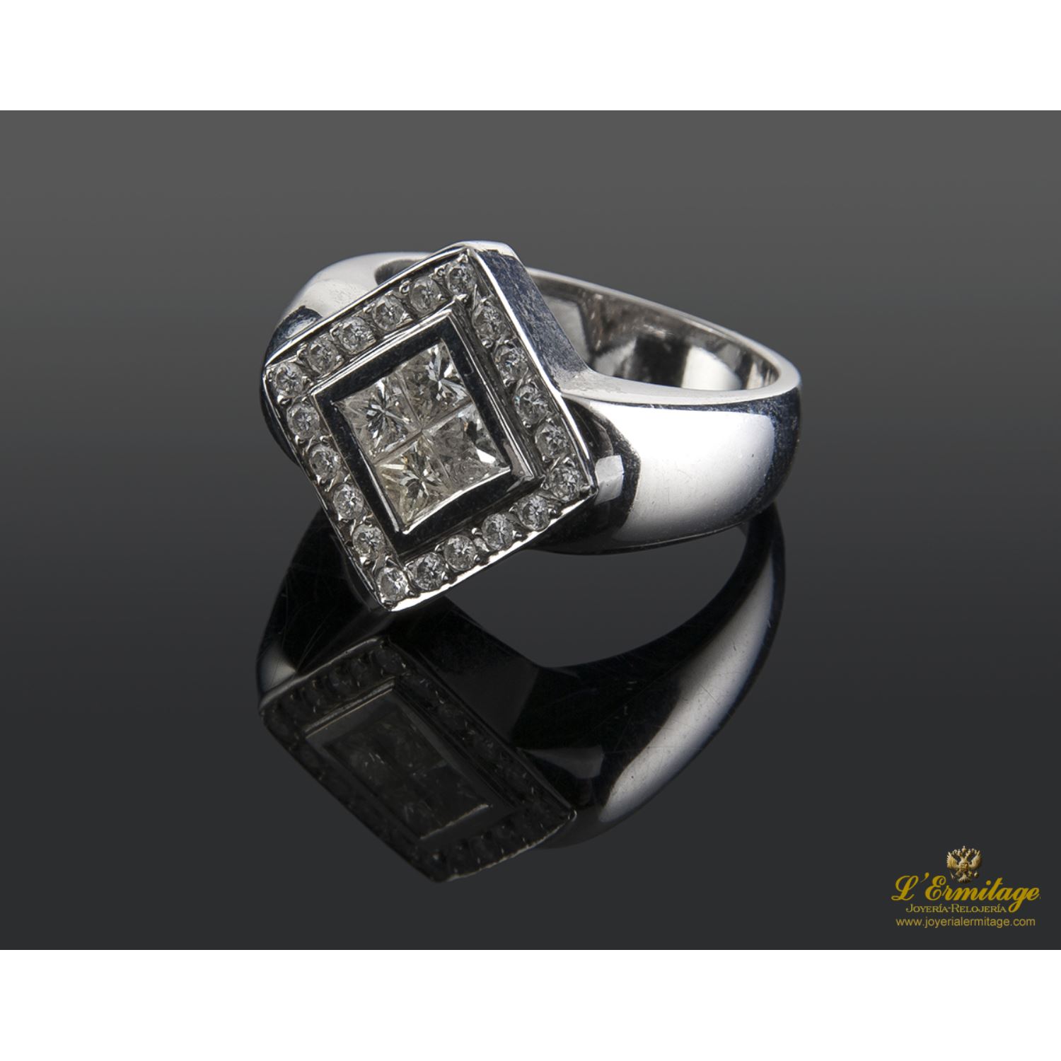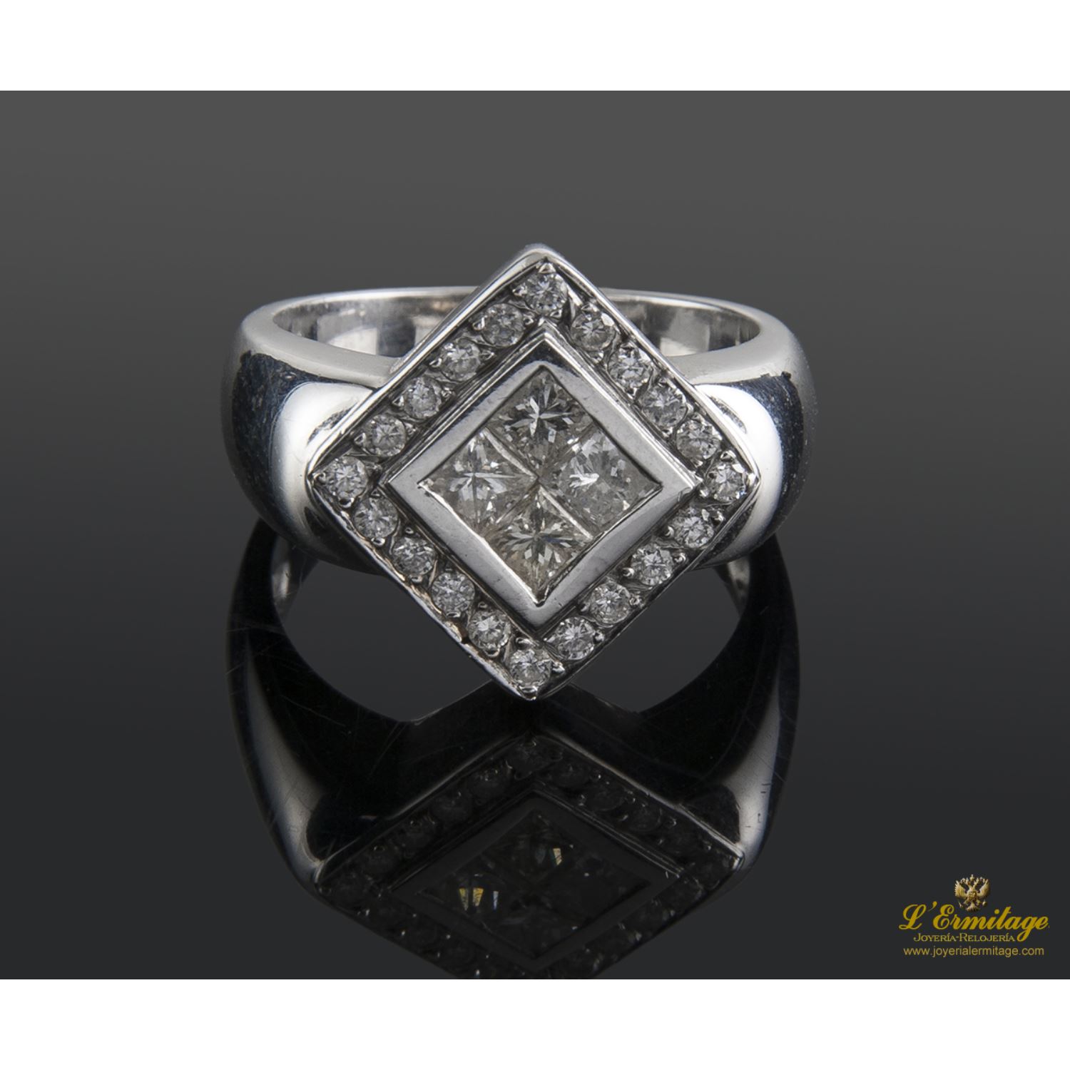 ANILLO DE ORO BLANCO CON 4 DIAMANTES NATURALES TALLA PRINCESA ENGASTADOS EN CHATÓN INVISIBLE Y CERCO DE DIAMANTES NATURALES TALLA BRILLANTE