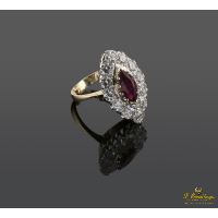 SORTIJA REALIZADA EN ORO AMARILLO Y ORO BLANCO. PRESENTA UN RUBÍ CENTRAL TALLA NAVETTE CON ORLA DE DIAMANTES TALLA BRILLANTE REDONDA.