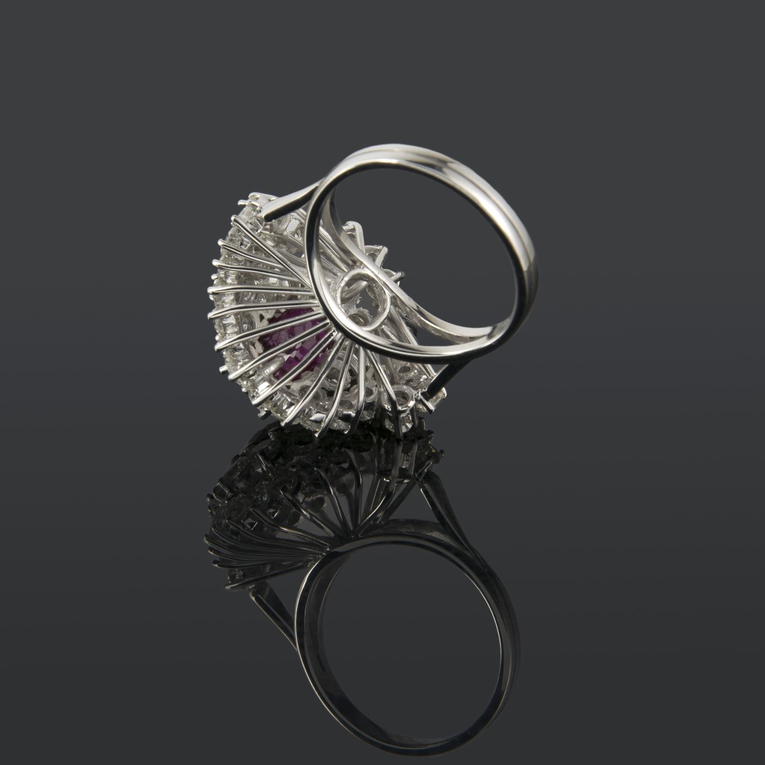 Sortija en oro blanco 14k con brillantes y rubí.
