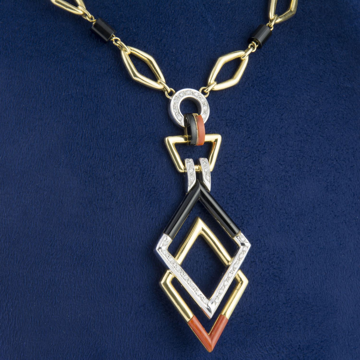 Gargantilla antigua oro amarillo ónix coral y diamantes. 60 Cm largo.