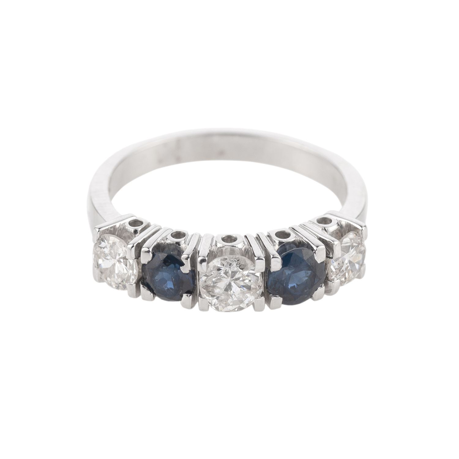 Sortija cinquillo realizado en oro blanco con tres brillantes engastados en garras y dos zafiros engastados en garras.