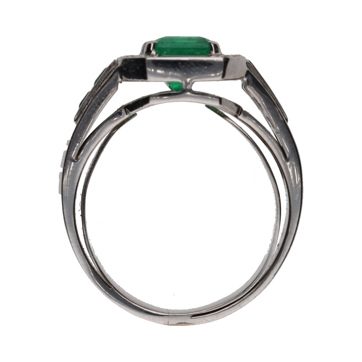Sortija realizada en oro blanco. Presenta una esmeralda central cuadrada engastada en garras acompañada de dos esmeraldas talla baguette y diamantes engastados en grano. Diamantes y esmeraldas en brazos. Talla 13.