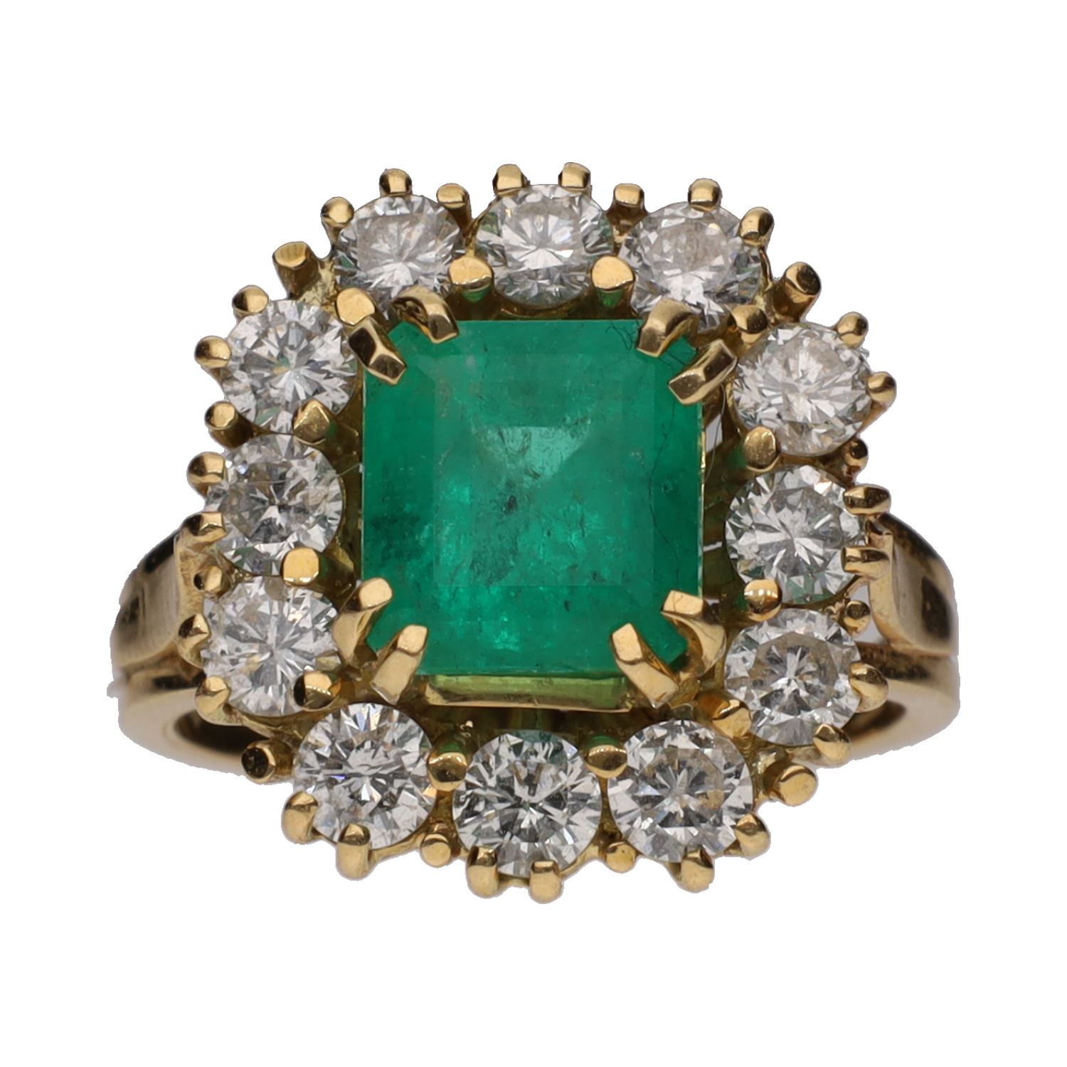 Sortija realizada en oro amarillo. Presenta una esmeralda central talla esmeralda engastada en garras, y orla de brillantes naturales engastados en garras. Talla 15.
