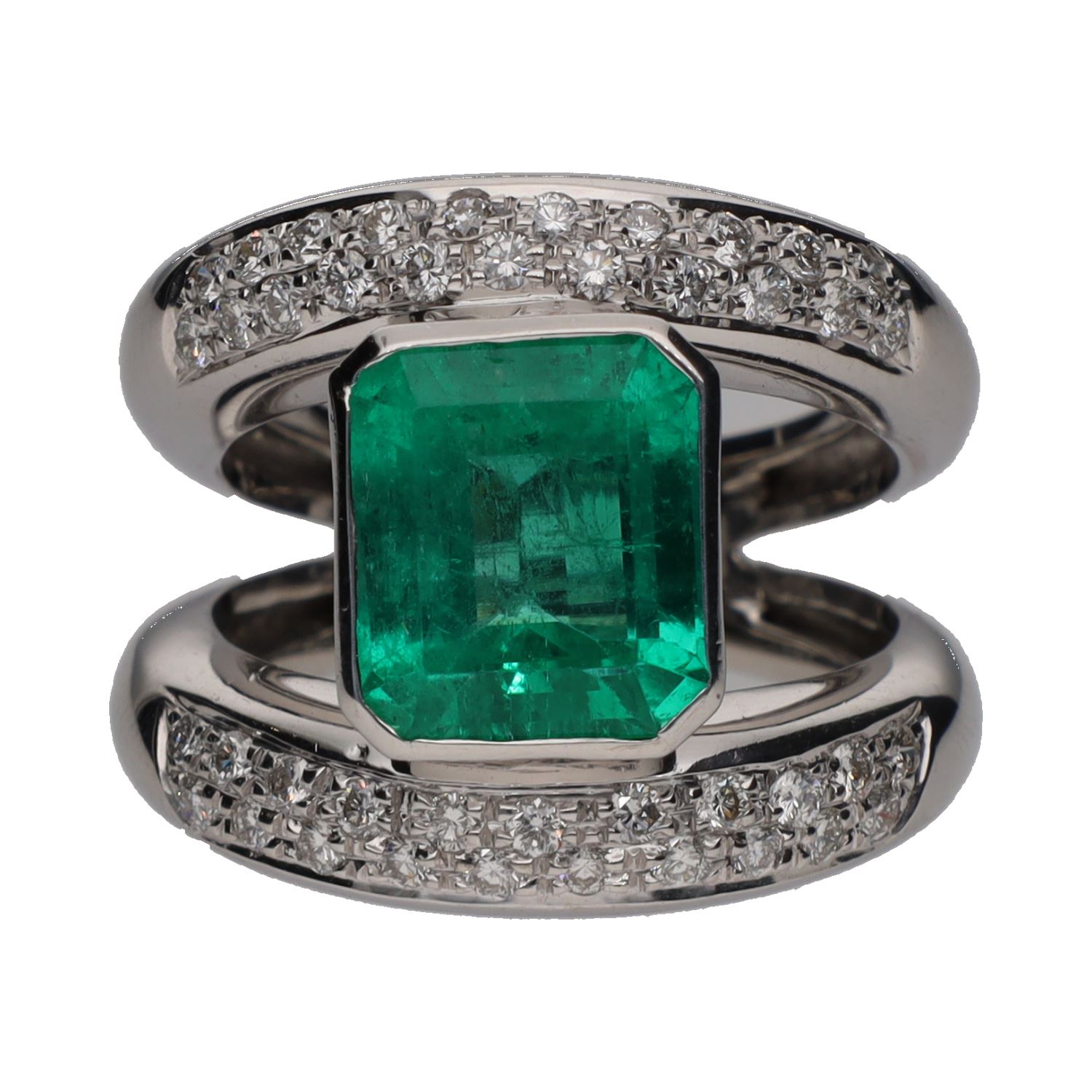 Sortija realizada en oro blanco con esmeralda y diamantes.