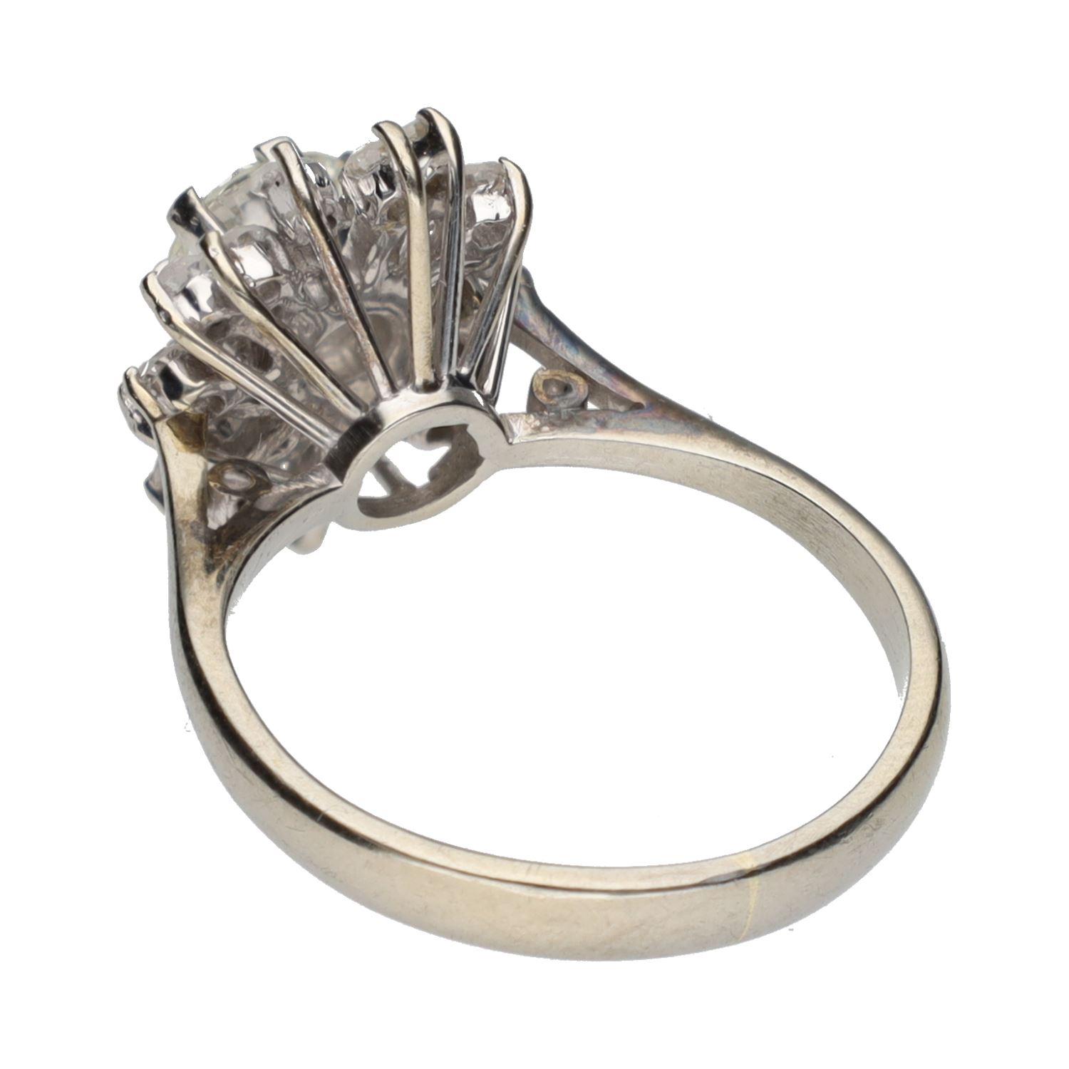 Solitario en oro blanco con brillante central y detalles con brillantes. Talla 8.