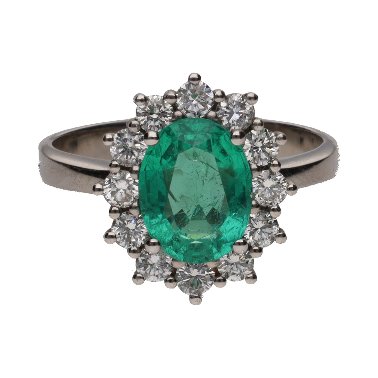 Sortija en oro blanco con esmeralda y orla de brillantes. Talla 14.