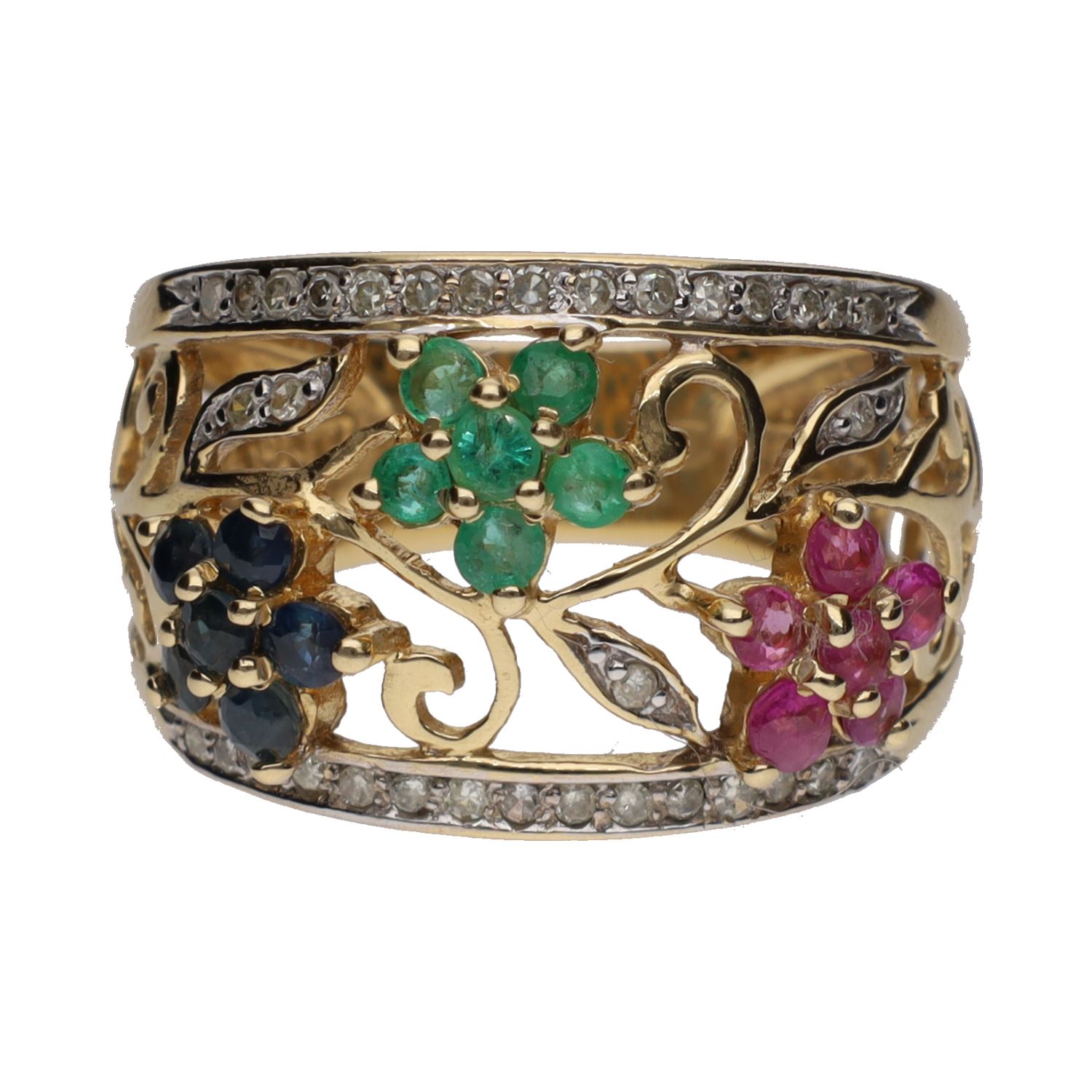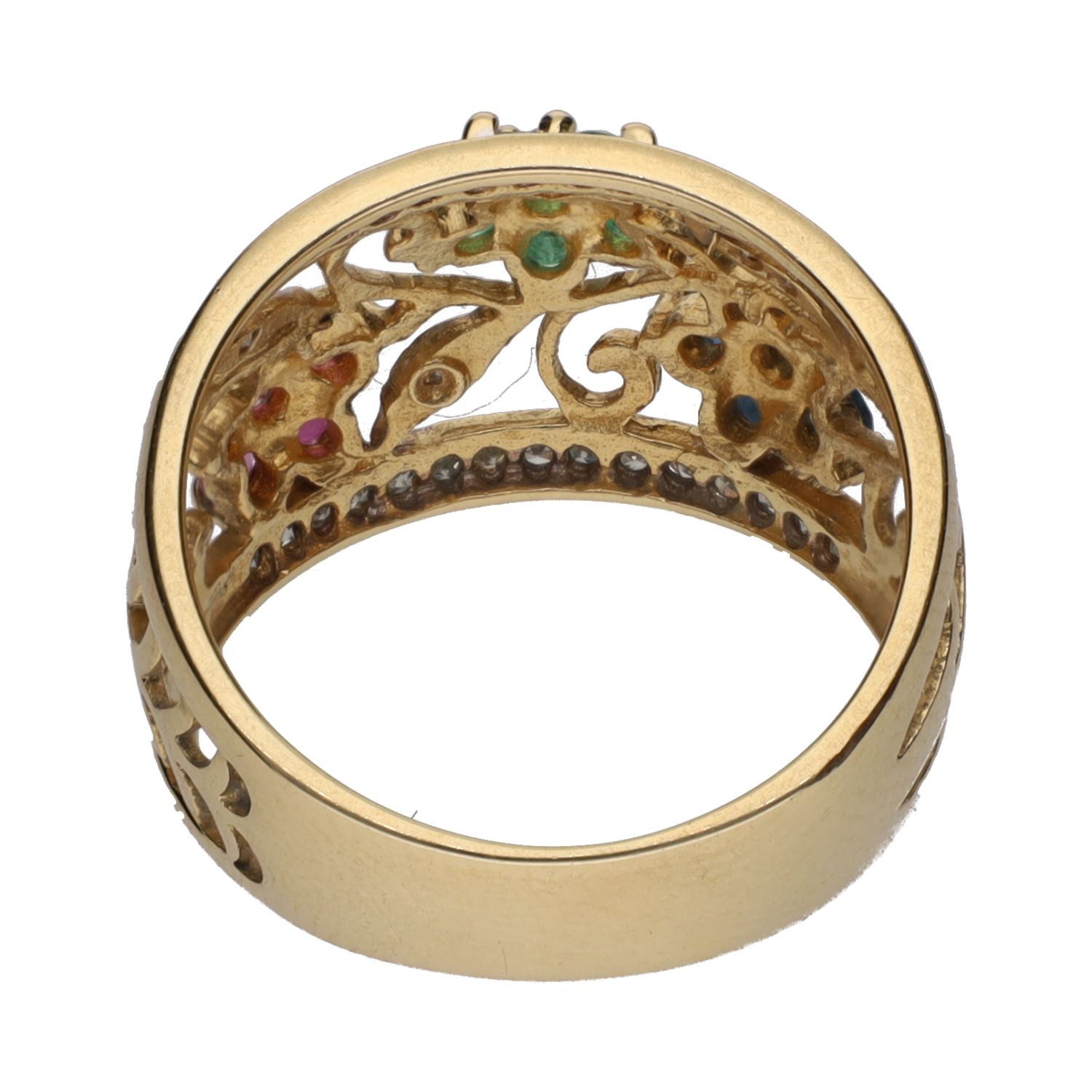 Sortija en oro amarillo con esmeraldas, rubíes, zafiros y brillantes. Talla 14.